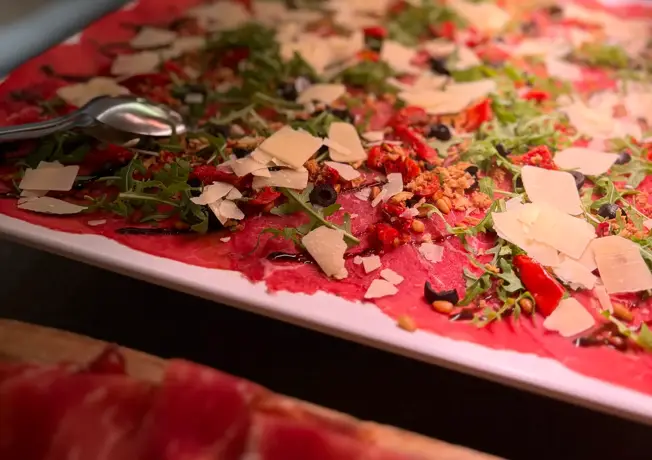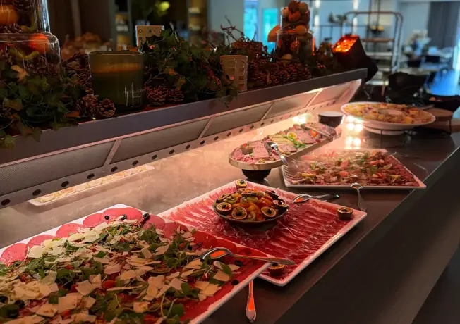 Geniet van een rijk aanbod aan voorgerechten, een verse saladebar, verfijnde hoofdgerechten (vlees, vis en vegetarisch) die à la minute worden bereid, smaakvolle warme bijgerechten en een verleidelijk dessertbuffet.