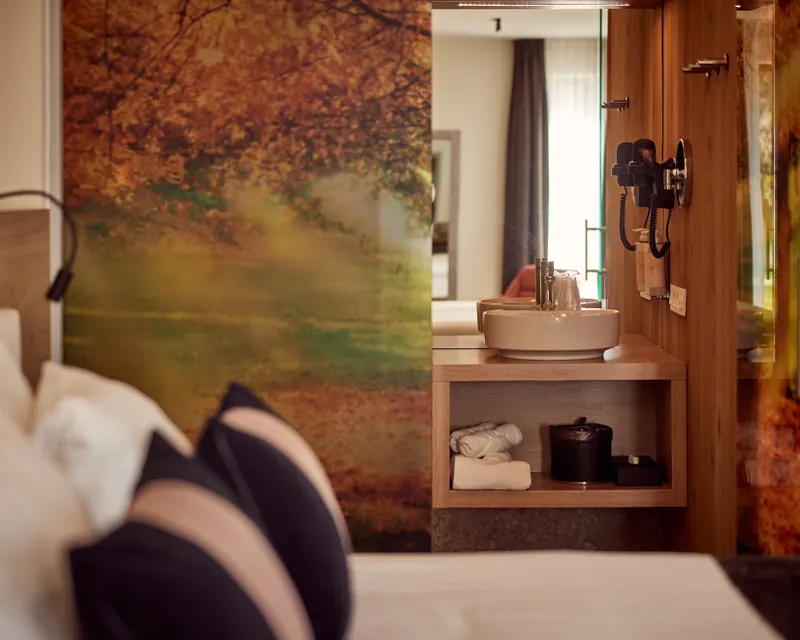 Chambre d'hôtel spacieuse (36m²) équipée des installations les plus souhaitables, dans un style contemporain luxueusement rafraîchissant avec balcon.