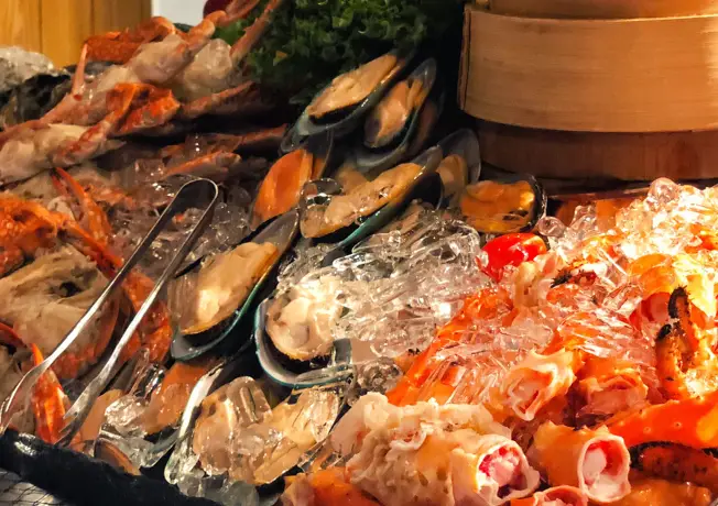 Voor €99 per persoon geniet je van een chique zeevruchtenavondbuffet met champagne van 19:00 tot 22:00.